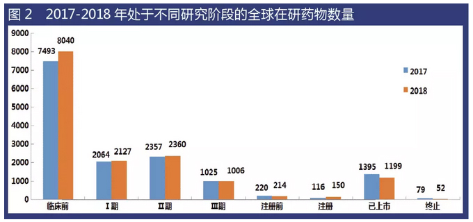 通過對比2018年和2017年處于不同研發(fā)階段的在研藥物規(guī)模后發(fā)現(xiàn),所有階段的在研藥物數(shù)量基本維持不變或僅有小幅變動。
