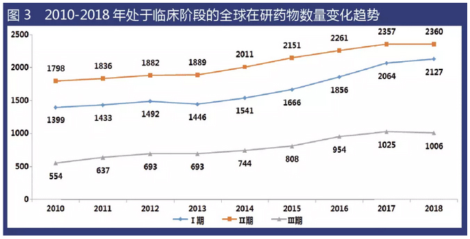 對處于臨床研究階段的在研藥物數(shù)據(jù)進一步分析后發(fā)現(xiàn),2018年處于Ⅰ期、Ⅱ期和Ⅲ期臨床研究階段的藥物數(shù)量分別為2127、2360和1006個,增幅分別為3.1%、0.1%和-1.9%。處于臨床Ⅱ期的藥物數(shù)量基本無變化,但處于臨床Ⅲ期的藥物數(shù)量則出現(xiàn)了小幅下滑,因此不難看出,處于研發(fā)后期的品種仍存在流失率較高的情況,應引起注意。