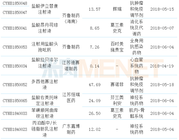 從治療類別看,14個品種中有5個為抗腫瘤和免疫調(diào)節(jié)劑,可見抗腫瘤領(lǐng)域是藥企們申報的重點,消化系統(tǒng)及代謝、神經(jīng)系統(tǒng)藥物、全身抗感染藥物均有2個產(chǎn)品;從產(chǎn)品的申報廠家看,齊魯制藥及子公司申報的產(chǎn)品最多;從申報的產(chǎn)品看,除了注射用頭孢曲松鈉有2家企業(yè)同時申報外,其他品種均只有1家企業(yè)申報;從產(chǎn)品的銷售額看,2017年在公立醫(yī)療機構(gòu)終端銷售額超過10億元的產(chǎn)品有11個(超過20億元的有8個),其中注射用泮托拉唑鈉接近90億元,注射用培美曲塞二鈉及多西他賽注射液接近50億元。