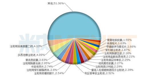 截至目前,申報一致性評價的抗腫瘤產(chǎn)品在2017年中國公立醫(yī)療機構(gòu)終端抗腫瘤和免疫調(diào)節(jié)劑的競爭格局中均處于主導地位,注射用培美曲塞二鈉以4.13%的比例位居首位,多西他賽注射液以4.09%的比例緊接其后,注射用胸腺法新以2.95%的比例排位第四。