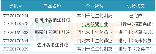 截至目前,一致性評價中準備開展/已開展/已完成BE試驗的注射劑有5個登記號,涉及企業(yè)3家,品種3個。從進行試驗的企業(yè)看,常州千紅生化藥業(yè)、河北常山生化藥業(yè)均有2個產(chǎn)品處于試驗階段;從試驗的產(chǎn)品看,有2家藥企進行BE試驗的依諾肝素鈉注射液,深圳市天道醫(yī)藥已搶先一步,其產(chǎn)品已經(jīng)處于申報一致性評價的隊列。