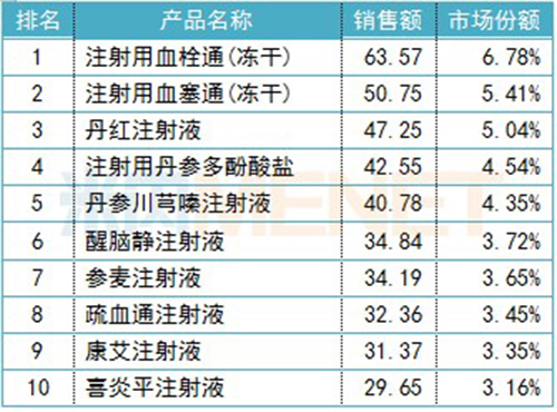 品牌TOP10銷售額均超過25億元,其中,梧州制藥(集團(tuán))的注射用血栓通(凍干)、山東丹紅制藥的丹紅注射液等7個(gè)是獨(dú)家品種。