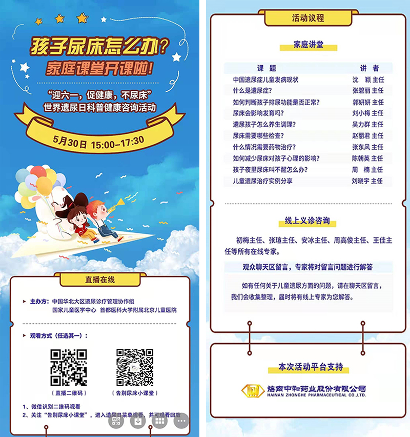 此次世界遺尿日線上活動(dòng)由海南中和藥業(yè)股份有限公司獨(dú)家支持并取得了圓滿成功,各位家長(zhǎng)們對(duì)此次線上義診活動(dòng)形式紛紛給予好評(píng),均表示受益頗多。