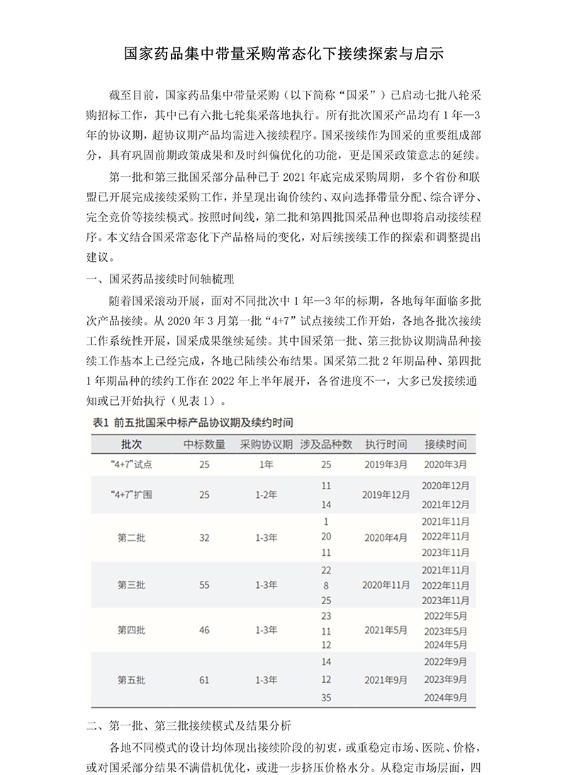 國家藥品集中帶量采購常態化下接續探索與啟示