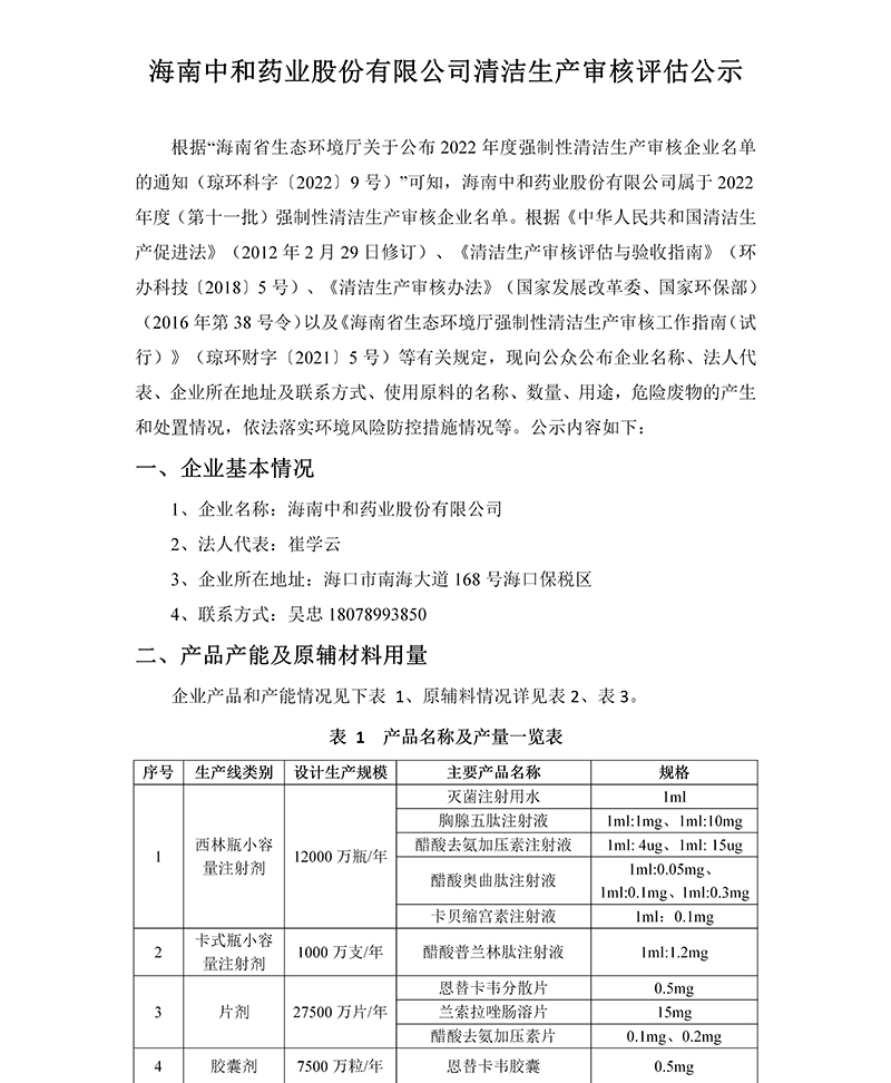 海南中和藥業(yè)股份有限公司清潔生產(chǎn)審核評(píng)估公示