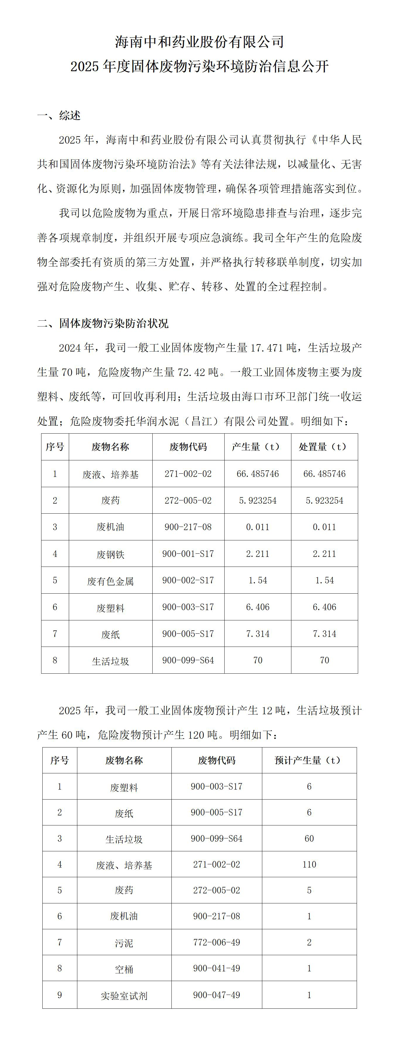 海南中和藥業(yè)股份有限公司固體廢物污染環(huán)境防治信息公開(2025年度)