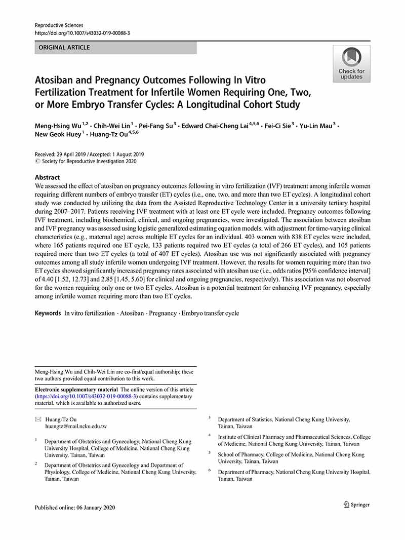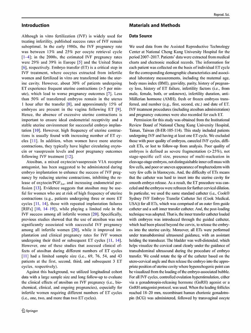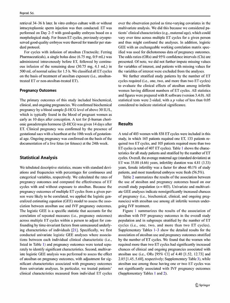 一項(xiàng)縱向隊(duì)列研究:阿托西班用于單個(gè)、兩個(gè)或多個(gè)胚胎移植周期的患者體外受精后的妊娠結(jié)局