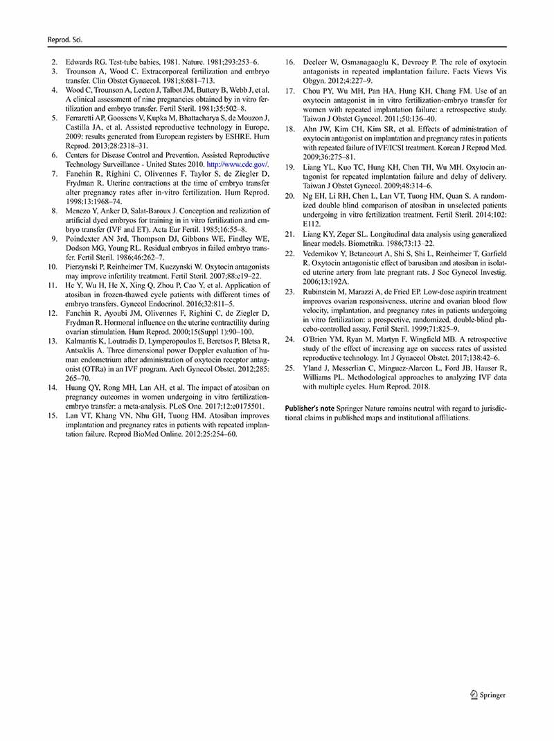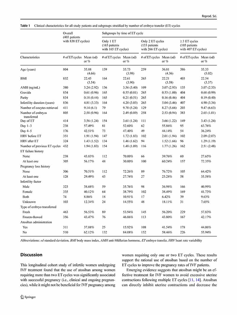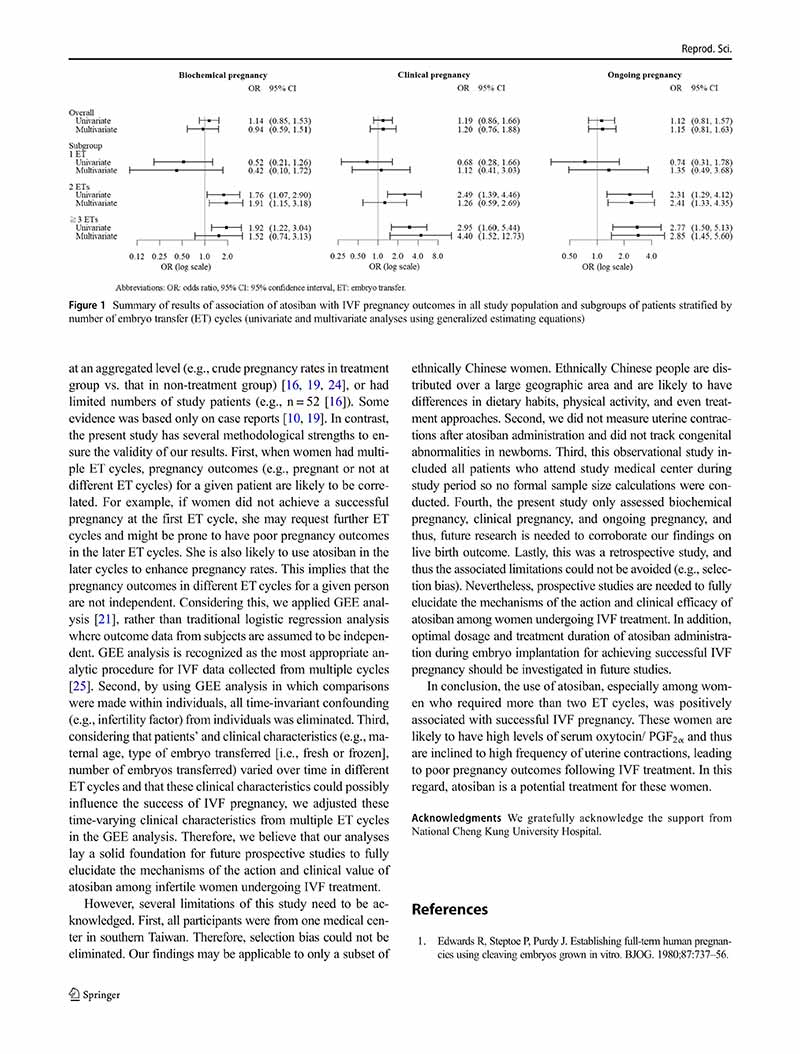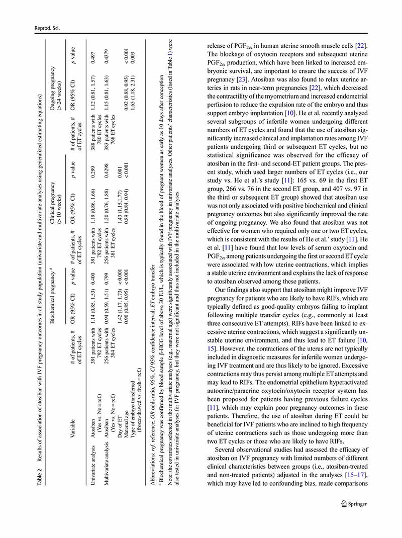 結(jié)論:注射阿托西班是一種潛在的提高體外受精妊娠率的治療方法,特別是在需要兩個(gè)以上胚胎移植周期的不孕婦女中。