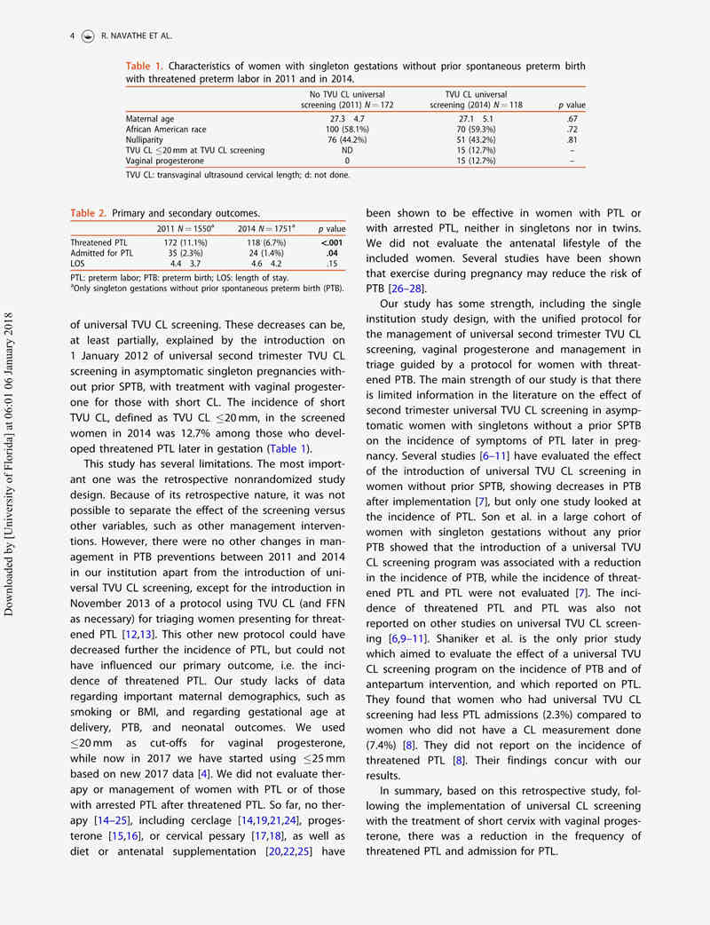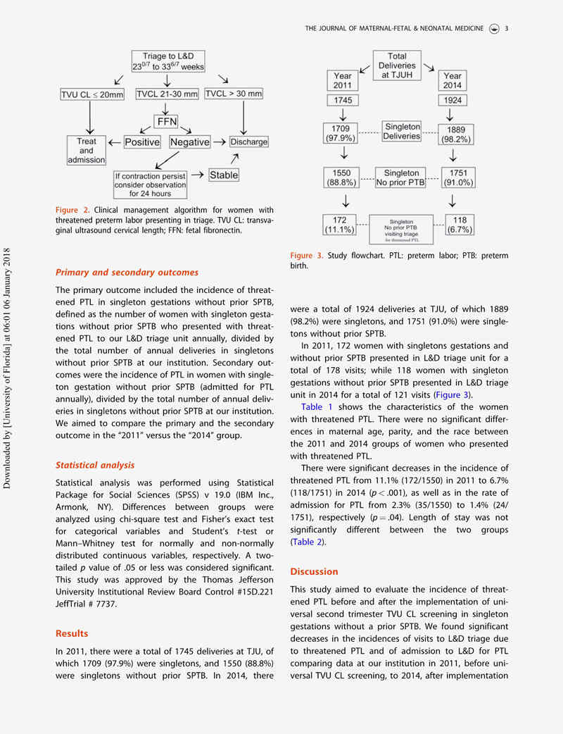 研究設計:這是一項回顧性隊列研究,研究對象是2011年(11日至1231日)和2014年(11日至1231日)因先兆早產在Thomas Jefferson大學醫院(TJU)(賓夕法尼亞州費城)就診的所有孕23 + 0/733 + 6/7周之間且既往無SPTB的單胎妊娠孕婦。自201211日開始起的兩年中開展TVU CL篩查作為新方案。該方案包括對孕18 + 0/7 - 23  + 0/7周所有無SPTB病史的單胎妊娠進行TVU-CL測量(解剖結構檢測)。排除既往有SPTB病史的孕婦。主要結局是先兆早產PTL的發生率,定義為每年在我們 L&D分娩分診單位,既往無SPTB的單胎妊娠出現先兆早產孕婦的人數以既往無SPTB病史的單胎妊娠孕婦的年分娩總人數。次要結局是PTL的發生率,定義為每年既往無SPTB病史的單胎妊娠孕婦每年因PTL入院的人數除以既往無SPTB病史的單胎妊娠孕婦年分娩總人數;以及住院時間。我們旨在比較“2011”組和“2014”組的主要和次要結局。