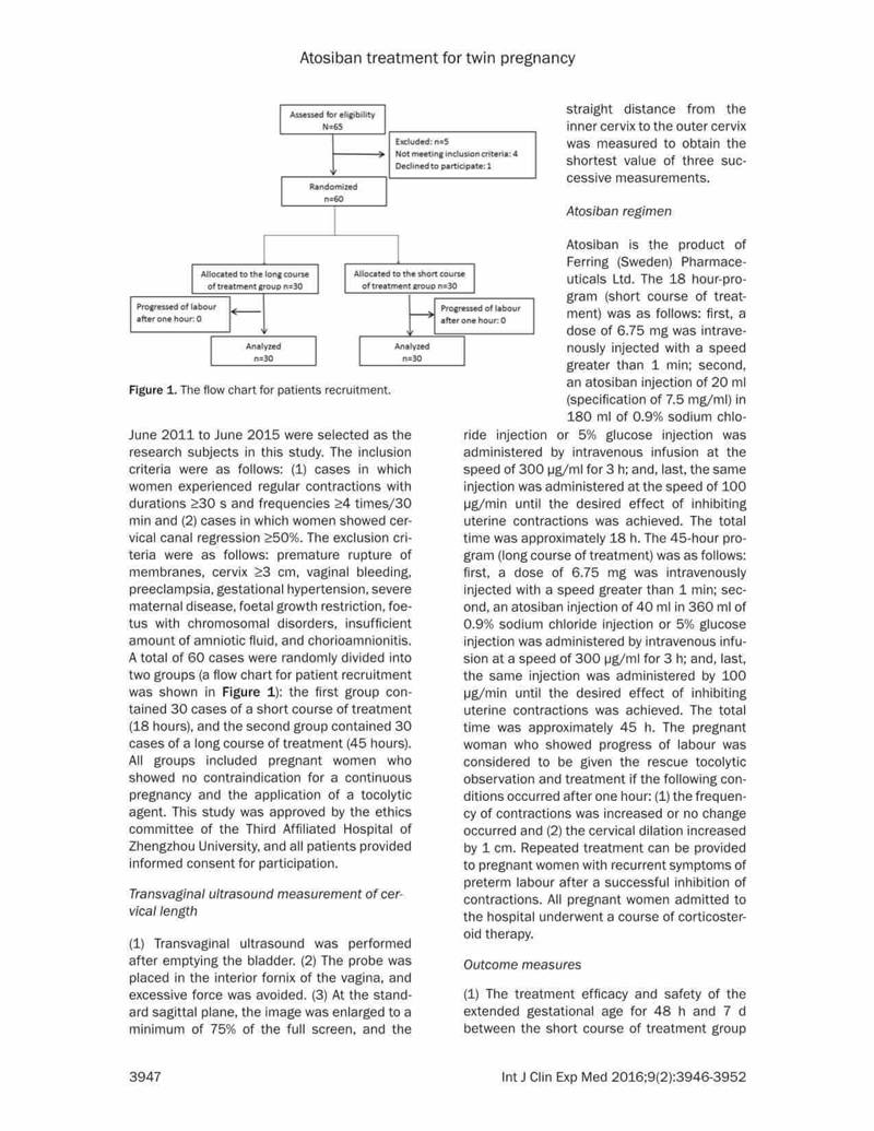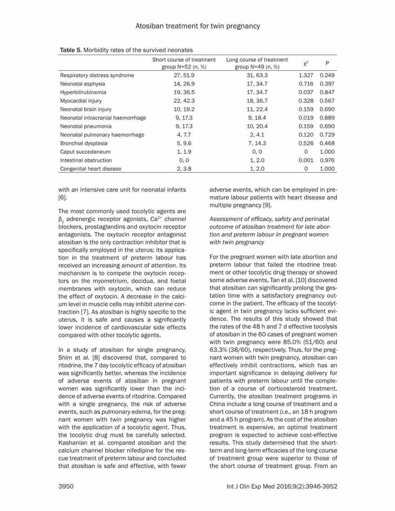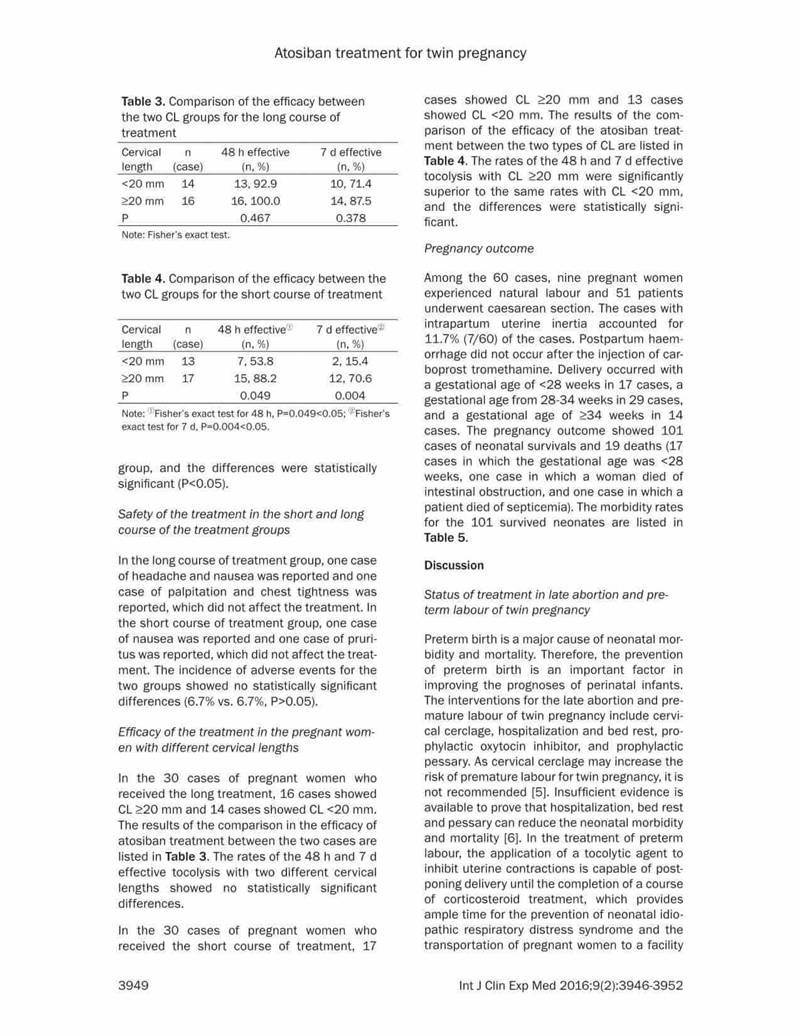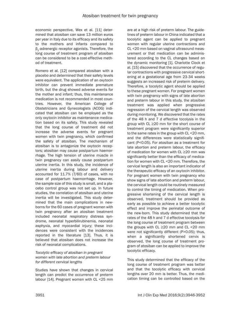 結(jié)論:阿托西班可有效延長(zhǎng)晚期流產(chǎn)以及早產(chǎn)的雙胎妊娠的妊娠時(shí)間。對(duì)于宮頸長(zhǎng)度<20mm的病例,長(zhǎng)療程治療更有效,效果更好。長(zhǎng)期治療不會(huì)增加母嬰的不良反應(yīng)。